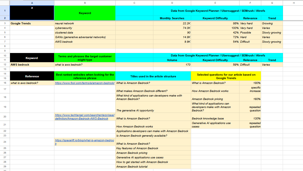 Digging deeper into the potential of the "aws bedrock" keyword, I checked Google Trends and noticed something interesting: lots of people were asking "What is Amazon Bedrock?" Intrigued by this trend, I went through Google search results, carefully looking at the top-ranking websites. My goal was to figure out how these articles were organized, what questions kept popping up, and which topics were really catching people's attention.